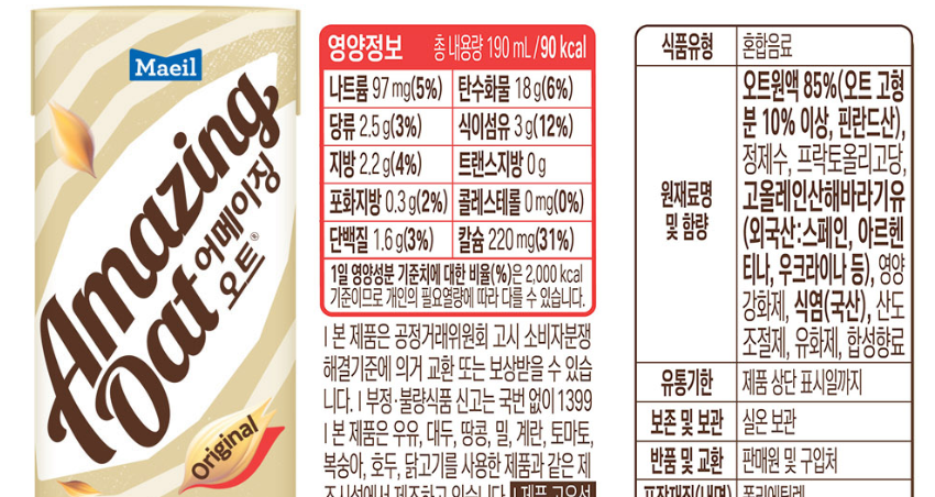 귀리로 만든, 우유 대체품인데 맛도 괜찮고 영양성분도 괜찮고.