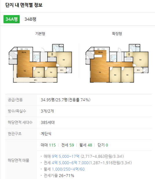 34평 단일평형(A,B형 타입만 다름)으로 구성되어,