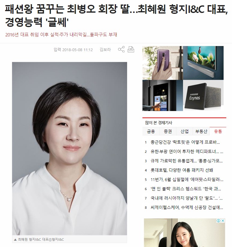 기사링크 : 패션왕 꿈꾸는 최병오 회장딸, 최혜원 형지 I&C 대표, 경영 능력 '글쎄'