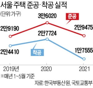 공급대책 쏟아냈지만…서울 주택 착공·준공 다 줄었다, 집값 불안 장기화 우려 1~5월 준공 주택 18% 감소 착공 물량은 1만여 가구 '뚝'
