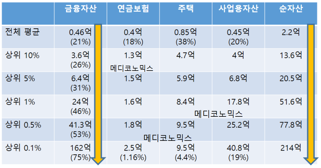 주택과 사업용 자산은 부채(전세 보증금, 담보대출 등 포함)을 제외한 순자산 기준이며