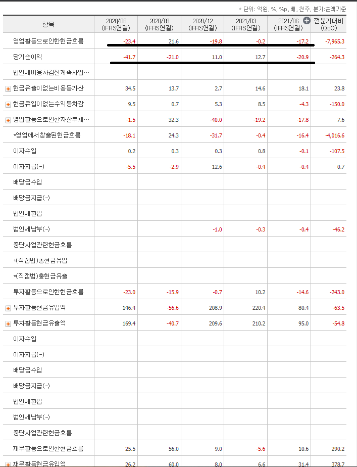 영업활동현금흐름이 계속 적자에